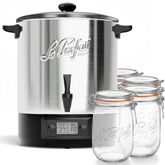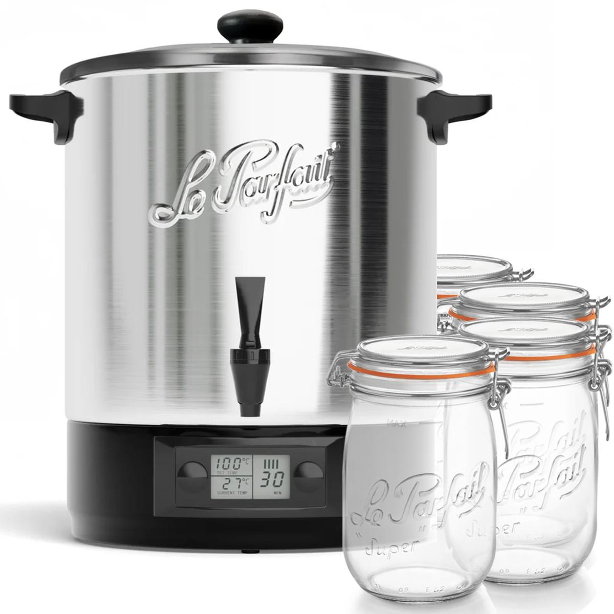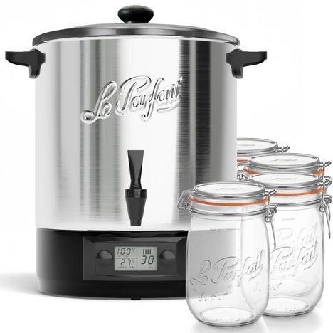 Le Parfait LPF.STV23INA Conçu pour simplifier toutes vos opérations de conservation, le stérilisateur électrique automatique Le Parfait® offre une capacité généreuse de 23 litres dans une cuve en inox brillant, pour accueillir plusieurs bocaux en une seule session.Doté de poignées thermo-isolantes, d'un couvercle en acier inoxydable et d'un robinet de vidange intégré, il allie sécurité, confort d'utilisation et élégance.Son écran LCD intuitif avec minuterie automatique permet de régler facilement la température jusqu'à 100?°C et la durée de stérilisation jusqu'à 180 minutes. La minuterie se déclenche automatiquement une fois la température atteinte, pour une gestion autonome et précise. La grille incluse se place au fond de l'appareil afin d'assurer une répartition uniforme de la chaleur.