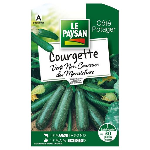 Culture semis: De mai à juin dans le Nord. A partir d'avril pour le Sud. En pleine terre, dans des trous (= poquets) espacés de 70 cm, remplis de compost demi-décomposé et de terreau. Déposer 4 à 5 graines par poquet. Au stade de 4-5 feuilles, éclaircir pour garder le plus beau plant de chaque poquet. Récolte floraison: De juillet aux gelées. Ne pas laisser les gros fruits sur la plante. Préparation du sol: Apprécie les sols profonds, riches en humus, placés à bonne exposition. Pour hâter la germination, tremper les graines dans l’eau quelques heures avant le semis. Culture: La récolte des courgettes active le développement de nouvelles fleurs et donc de nouveaux fruits : un cercle vertueux pour le plus grand plaisir du jardinier ! Entretien arrosage: Arroser régulièrement et maintenir le sol propre. Levée: 9-10 jours