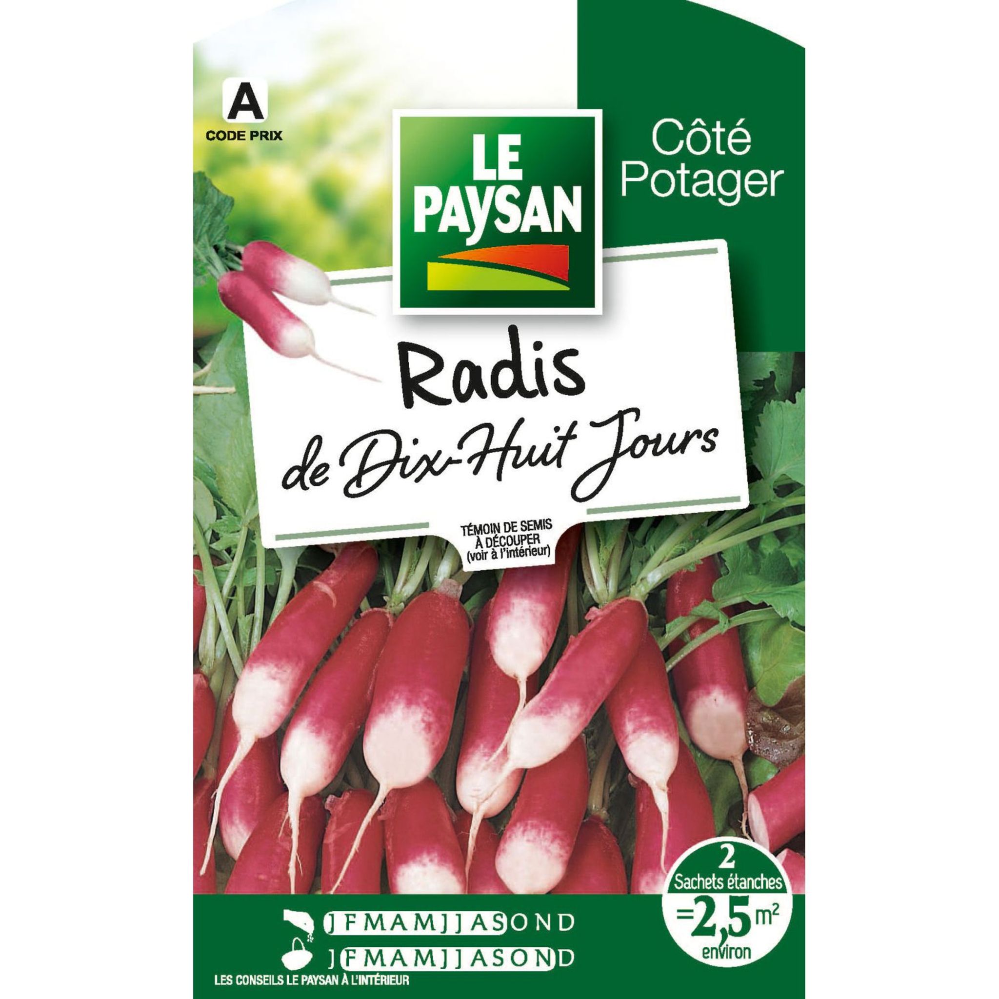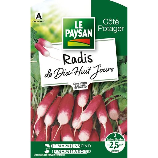 Culture semis: De janvier à mars, sous abri chauffé (12-15°C) De mars à septembre sous abri non chauffé En pleine terre à la volée ou en lignes distantes de 15 cm. Les radis demi-longs doivent être semés entre 1,5 et 3 cm de profondeur. Renouveler le semis tous les 15 jours pour obtenir une récolte continue. Au stade de 4-5 feuilles, éclaircir si besoin pour laisser 2-3 cm entre chaque plant. Récolte floraison: De février à avril. Et d’avril à novembre. Préparation du sol: Apprécie les terres riches et légères. Culture: La profondeur de votre semis influencera de façon importante la forme de vos radis. Pour ce radis demi-long, veillez à enterrer vos graines à 2 cm environ. Entretien arrosage: Arroser fréquemment et régulièrement. La récolte dépend de la qualité de l’arrosage. Levée: 3-4 jours