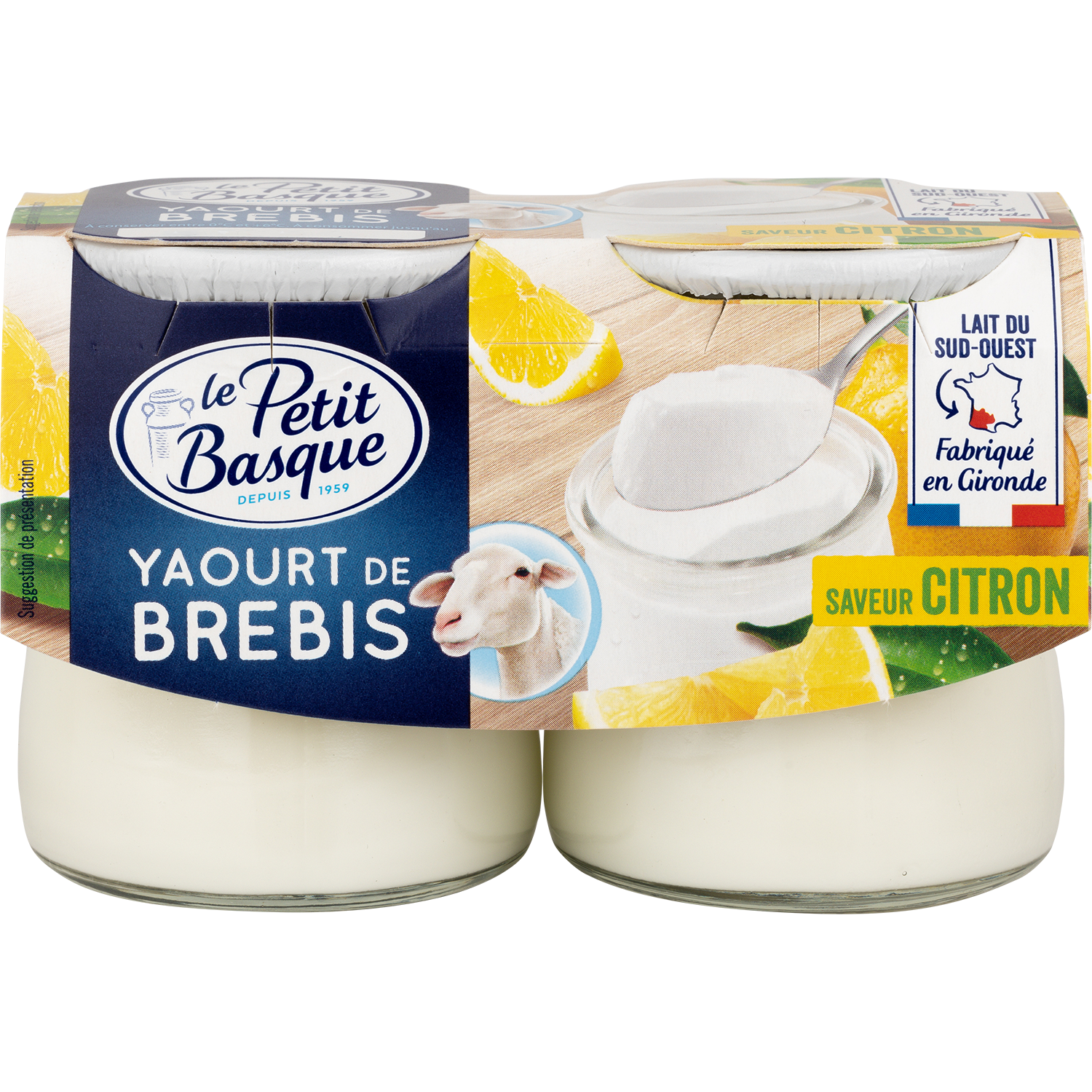 LAIT de brebis à 3% de matières grasses (origine : France), sucre 7.5%, arôme naturel de citron avec autres arômes naturels, ferments lactiques (dont LAIT)