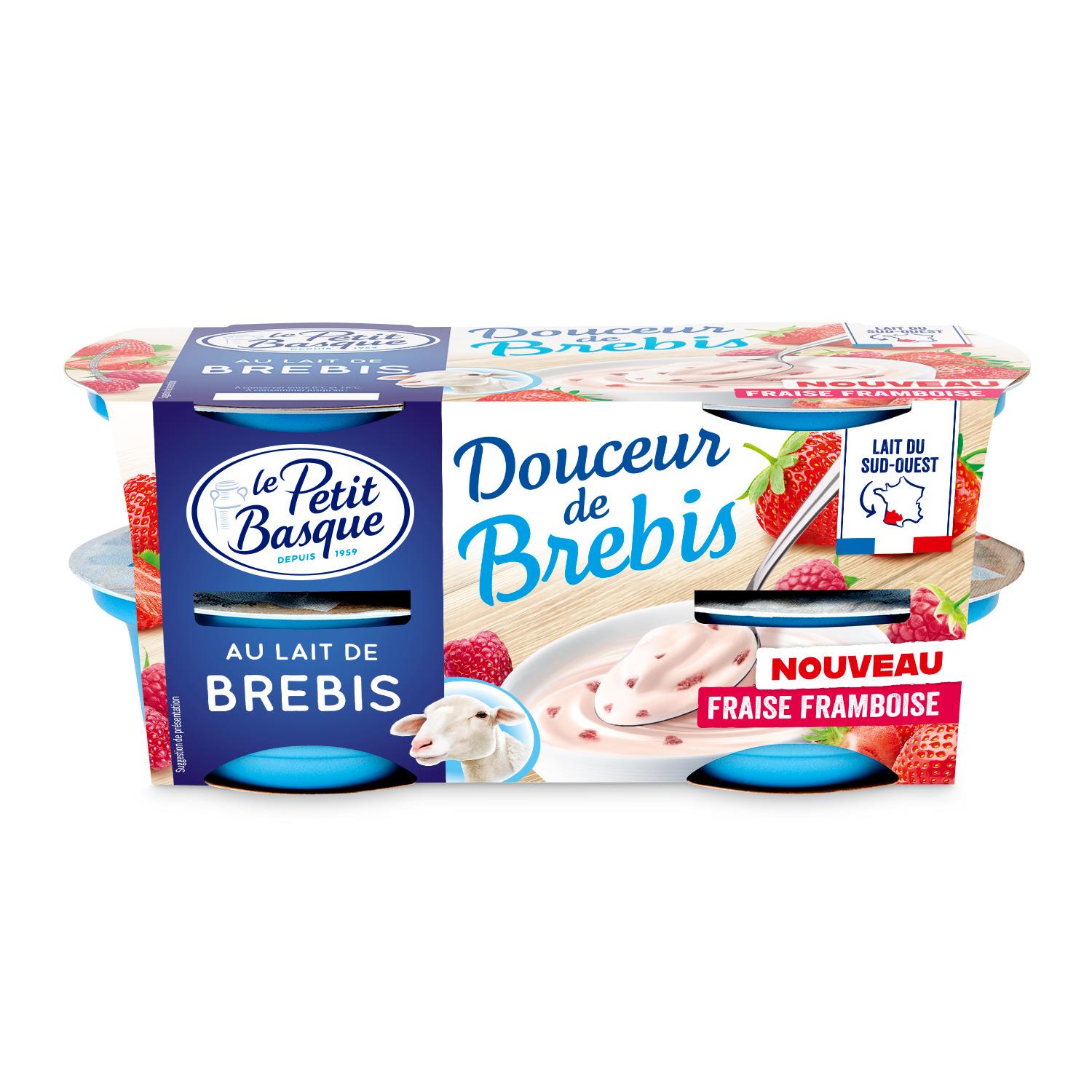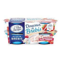 LAIT de brebis (origine : France), fraise 8.8%, sucre 8.3%, CREME de brebis (origine : France), perméat de LAIT de brebis (origine : France), framboise 1%, épaississant: amidon modifié, amidon de riz, arômes naturels goût fraise et framboise, conservateur de fruit : sorbate de potassium, jus de citron concentré, concentré de carotte pourpre, ferments lactiques (dont LAIT).