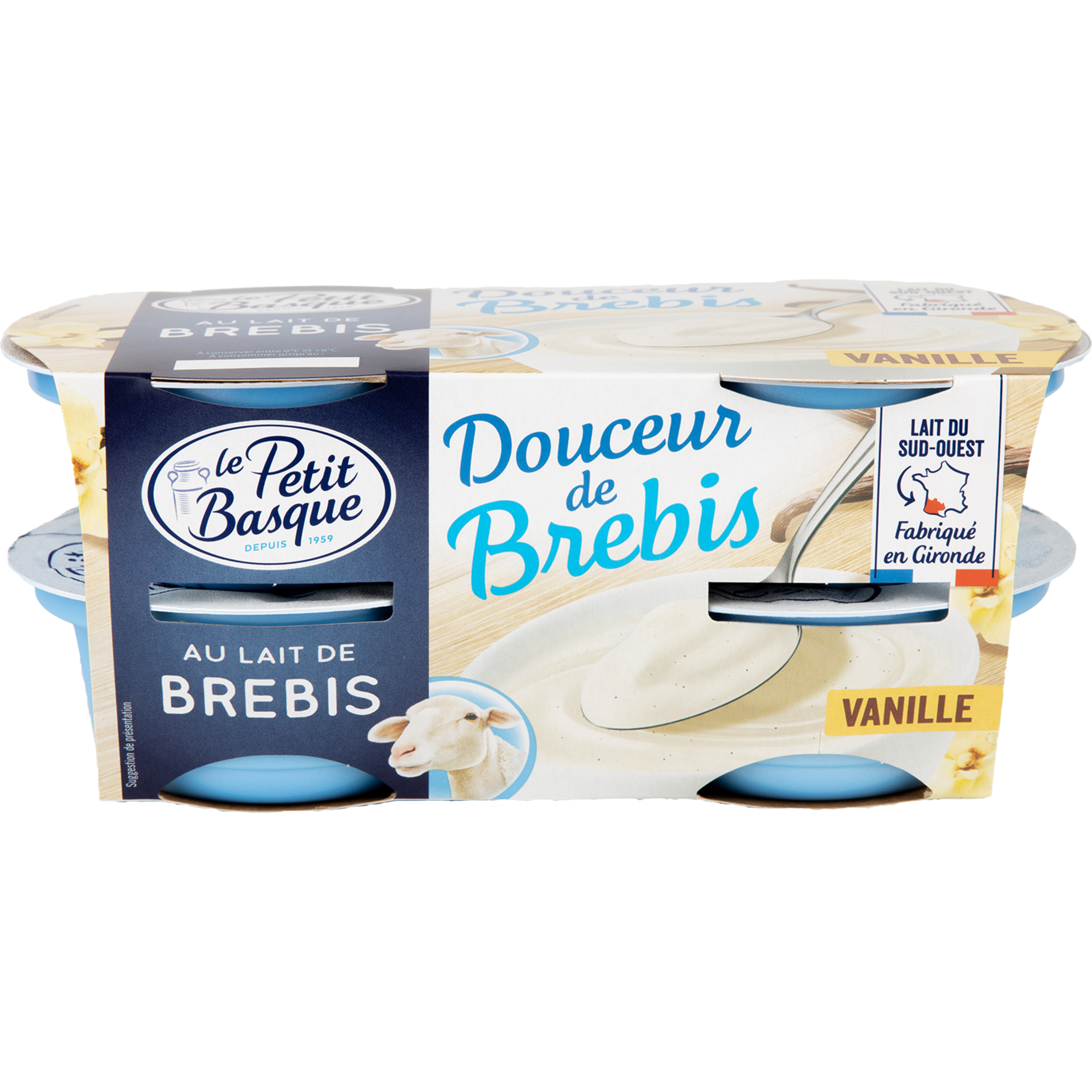 LAIT de brebis (origine : France), CREME de brebis (origine : France), eau, sucre 6.8%, perméat de LAIT de brebis (origine : France), amidon de maïs, amidon de riz, jus de citron, arôme naturel de vanille, ferments lactiques (dont LAIT), décor : écorce de vanille épuisée.
