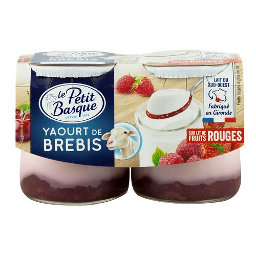 Yaourt au lait de brebis à 3% de matières grasses sucré sur un lit à base de fruits rouges aromatisé fraise et framboise