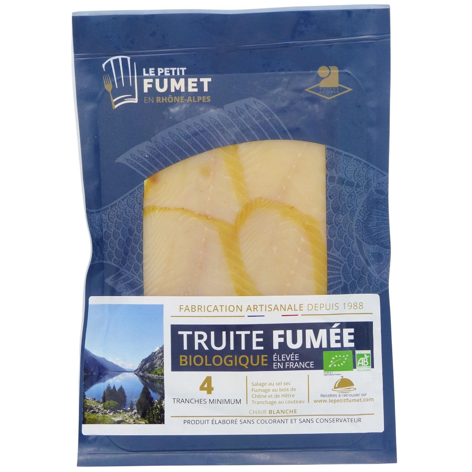 Truite Biologique élevée en France. Fumée au bois de hêtre et de chêne, salée au sel sec de mer à la main et tranché au couteau. 4 tranches.