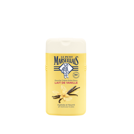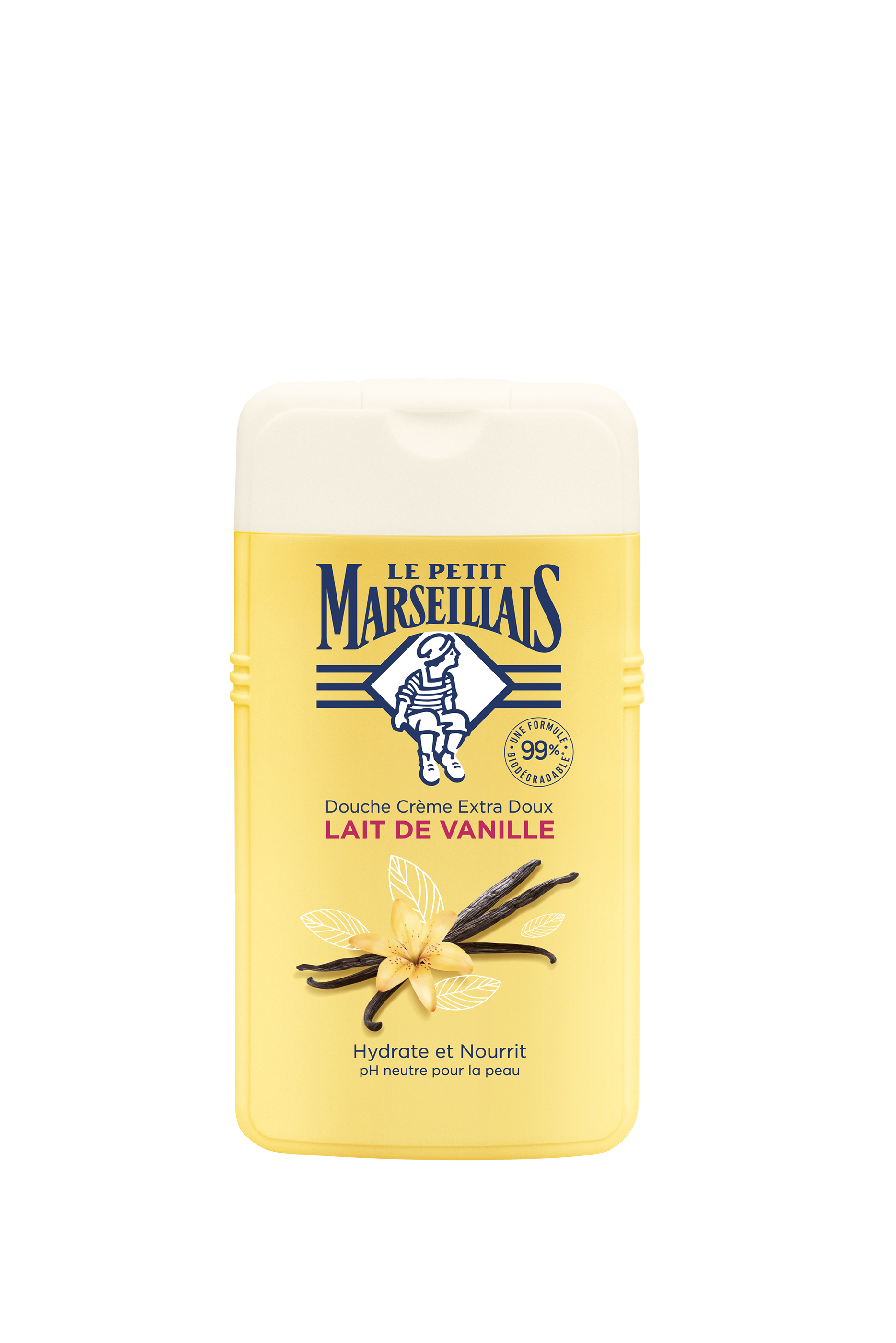 LE PETIT MARSEILLAIS GEL DOUCHE CREME EXTRA DOUX LAIT DE VANILLE 250ML Né au cœur de la Provence, Le Petit Marseillais a sélectionné des ingrédients gorgés de soleil pour créer ses douches Extra Doux aux parfums qui sentent bon la nature. Prendre soin de sa peau avec le Douche & Bain Crème au Lait de Vanille : Le Douche & Bain Crème au Lait de Vanille du Petit Marseillais lave en douceur votre peau, grâce à sa mousse légère qui libère un parfum gourmand et ensoleillé. Les bienfaits du Lait de Vanille : Issues du commerce équitable, les gousses de vanille du Petit Marseillais sont récoltées à la main, puis séchées au soleil pour libérer un parfum exquis et gourmand. C’est après l’infusion de ces gousses que l’on obtient un lait de vanille. Au-delà de son parfum délicat et unique, la vanille est aussi connue pour ses nombreux bénéfices pour la peau. Un geste nature pour ma peau : - Hydratant d'origine naturelle - 99% d'ingrédients biodégradables - Flacon 100% recyclable - pH neutre pour la peau - Testé sous contrôle dermatologique Le Petit Marseillais s'engage avec le Conservatoire du Littoral pour préserver la biodiversité de Provence.
