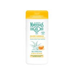 LE PETIT MARSEILLAIS BAUME SURGRAS HYPOALLERGENIQUE ALOE VERA & BEURRE DE KARITE 650ML Comment prendre soin des peaux sensibles et délicates de toute la famille en se faisant plaisir ? Découvrez le Baume Douche & Bain Surgras à la Sève d'Aloe Vera & Beurre de Karité Le Petit Marseillais. Hypoallergénique*, sa formule baume surgras lave en douceur, nourrit intensément et apaise les peaux sensibles et sèches des Petits et Grands**. Le saviez-vous ? Utilisé dès l'Antiquité dans les recettes médicinales et cosmétiques traditionnelles, l'Aloe Vera puise toute sa force dans sa sève riche en nutriments, pour résister à la chaleur et à la sécheresse. Une feuille entière d'aloe vera dans ce flacon ! Notre formule • Sans savon • Sans paraben • Hypoallergénique* • Parfum créé pour les peaux sensibles • pH neutre pour la peau • Testée sous contrôle dermatologique *Formulée pour minimiser les risques d'allergies **Enfants à partir de 3 ans Formule enrichie en agent hydratant d'origine végétale Ingrédients de la base lavante facilement biodégradables