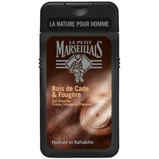Le Bois de Cade et la Fougère du Petit Marseillais C'est sur les terres de garrigues et maquis méditerranéens que pousse le cade du Petit Marseillais. Plante sauvage, la fougère s'épanouit particulièrement bien dans les lieux frais et ombragés. Notre fougère est récoltée à la main puis infusée pour en extraire toute sa fraîcheur. Une formule 3-en-1 pour les Hommes En un seul geste, le Gel Douche au Bois de Cade et à la Fougère du Petit Marseillais lave en douceur le corps, le visage et les cheveux. Il laisse la peau hydratée et confortable et convient à tous les types de cheveux. Sa mousse facile à rincer libère un parfum intense et boisé. pH neutre pour la peau Testé sous contrôle dermatologique Ingrédients de la base lavante facilement biodégradables Enrichi en agent hydratant d'origine végétale. LE PETIT MARSEILLAIS GEL DOUCHE CORPS VISAGE CHEVEUX HOMME BOIS DE CADE & FOUGERE 250ML