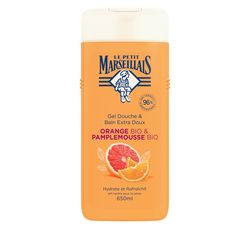 Le Petit Marseillais Douche Extra doux Orange et Pamplemousse 650 ml La douche & bain à l’orange et au pamplemousse lave en douceur votre peau. Sa mousse onctueuse et facile à rincer libère un parfum d’agrumes aux notes toniques et ensoleillés.