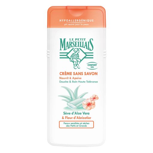 Comment prendre soin des peaux sensibles et délicates de toute la famille en se faisant plaisir ? Découvrez le Douche & Bain Crème Sans Savon à la Sève d'Aloe Vera & Fleur d'Abricotier Le Petit Marseillais. Hypoallergénique*, sa formule crème sans savon lave en douceur, nourrit et apaise les peaux sensibles et sèches des Petits et Grands**. Le saviez-vous ? Utilisé dès l'Antiquité dans les recettes médicinales et cosmétiques traditionnelles, l'Aloe Vera puise toute sa force dans sa sève riche en nutriments, pour résister à la chaleur et à la sécheresse. Une feuille entière d'aloe vera dans ce flacon ! Notre formule • Sans savon • Sans paraben • Hypoallergénique* • Parfum créé pour les peaux sensibles • pH neutre pour la peau • Testée sous contrôle dermatologique *Formulée pour minimiser les risques d'allergies. **Enfants à partir de 3 ans Formule enrichie en agent hydratant d'origine végétale Ingrédients de la base lavante facilement biodégradables LE PETIT MARSEILLAIS CREME SANS SAVON HYPOALLERGENIQUE ALOE VERA & FLEUR D'ABRICOTIER 650ML