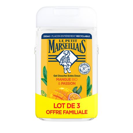 "Le Petit Marseillais vous emmène en voyage ! Inspiré par les parfums exotiques et avec son envie irrésistible de vous faire plaisir, il crée des des gels douche qui sentent bon le soleil. C’est sous le soleil des Tropiques que la Mangue Bio et le Fruit de la Passion sont récoltés. Ensemble, ils ont inspiré le parfum tropical de notre gel douche. 92% d'ingrédients d'origine naturelle, pH neutre pour la peau et sans colorant