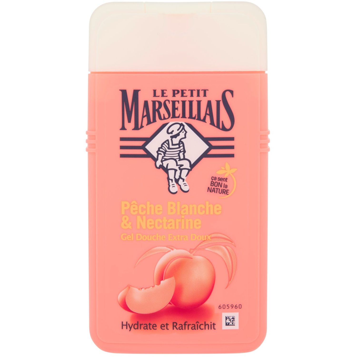 LE PETIT MARSEILLAIS GEL DOUCHE EXTRA DOUX PECHE BLANCHE & NECTARINE 250ML La Pêche Blanche et la Nectarine du Petit Marseillais C'est sous le soleil généreux du bassin méditerranéen que la pêche blanche et la nectarine sont récoltées pendant l'été, à pleine maturité. Ainsi gorgées de soleil, elles sont appréciées pour leurs chairs colorées, sucrées et juteuses. Une Formule Extra Douce pour la Peau Le Gel Douche à la Pêche Blanche et à la Nectarine du Petit Marseillais lave en douceur votre peau, grâce à sa mousse légère qui libère un parfum frais et gourmand. • pH neutre pour la peau • Testé sous contrôle dermatologique • Ingrédients de la base lavante facilement biodégradables • Enrichi en agent hydratant d'origine végétale