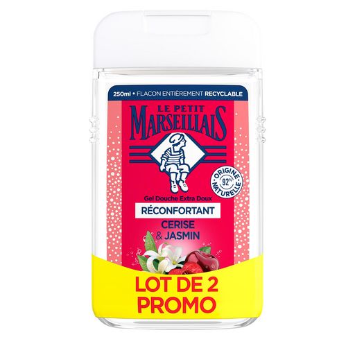 Gel Douche Extra Doux Cerise & Jasmin Le Petit Marseillais débute son histoire dans le sud de la France. Inspiré par la Provence et avec une envie irrésistible de vous faire plaisir, il crée le Gel Douche Extra Doux. Afin de prendre soin de votre peau, sa formule au pH neutre pour la peau et sans colorant nettoie tout en douceur. Le Gel Douche Extra Doux Jasmin & Cerise offre une mousse légère aux notes fruitées et florales. Il libère un parfum réconfortant pour une sensation agréable. Emballage entièrement recyclable et fabriqué avec au moins 21 % de matière recyclée. Le produit a été testé sous contrôle dermatologique. Ce Gel Douche Extra Doux est composé à 92 % d'ingrédients d'origine naturelle, les 8 % restants étant consacrés à la bonne conservation de la formule et au parfum.