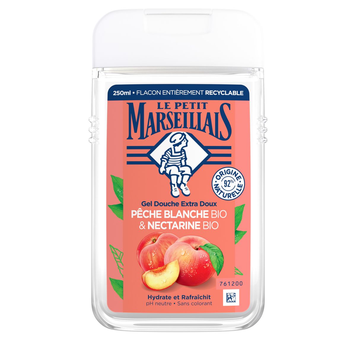 "Inspiré par la Provence et avec une envie irrésistible de vous faire plaisir, il crée le gel douche Extra Doux. Afin de prendre soin de votre peau, sa formule au pH neutre pour la peau et sans colorant nettoie tout en douceur. Le produit a été testé sous contrôle dermatologique. Ce gel douche est composé à 92 % d'ingrédients d'origine naturelle, les 8 % restants étant consacrés à la bonne conservation de la formule et au parfum. Le gel douche Extra Doux à la pêche blanche bio et à la nectarine bio offre une mousse légère aux notes fruitées et ensoleillées. Il libère un parfum frais pour une sensation vivifiante. Emballage entièrement recyclable et fabriqué avec au moins 21 % de matière recyclée Hydrate et rafraîchit