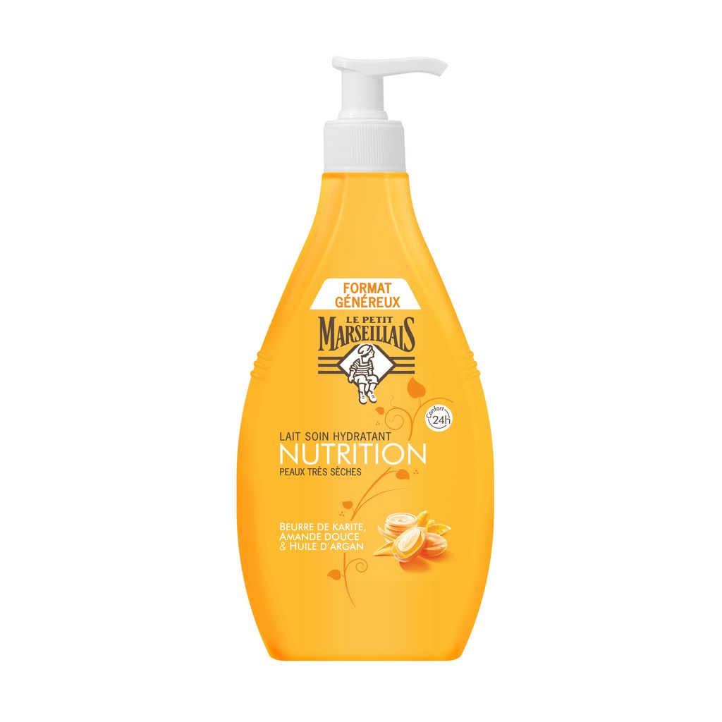 Lait Soin Corps Hydratant Nutrition Le Petit Marseillais a créé cette recette soin et plaisir Nutrition pour offrir à votre peau 24h d'hydratation. Il a associé des ingrédients efficaces dont le Beurre de Karité, l'Amande douce et l'Huile d’Argan pour une peau nourrie et belle pour 24h de confort. Texture plaisir et parfum délicieusement : ce lait allie soin et plaisir. Il pénètre rapidement sans coller.