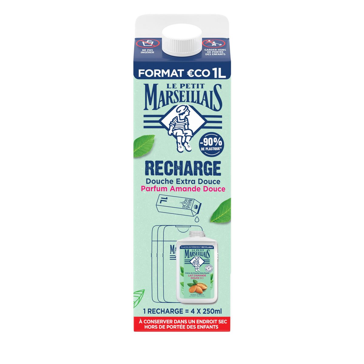 Emballage au top pour recyclage tiens moins place car peu se plier. Prix correct pour une recharge (1l). Le parfum est agréable.
