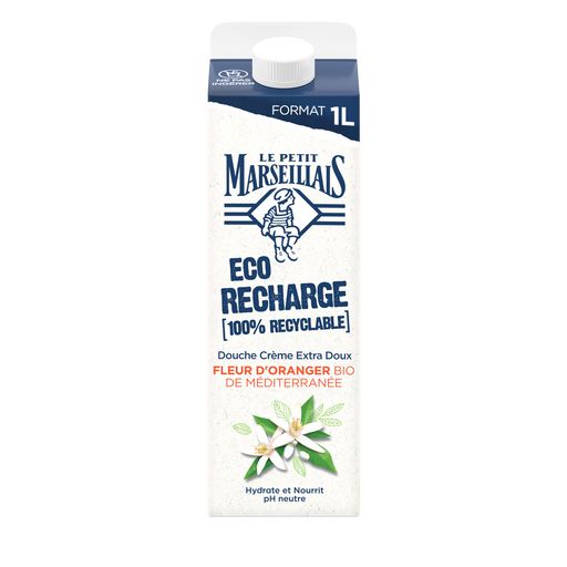 "Pour prendre soin de votre peau et de la nature, Le Petit Marseillais a créé ses éco-recharges en carton majoritairement recyclables. Tout le plaisir de notre Crème de Douche Extra Doux à la Fleur d'Oranger de Méditerranée, dans une éco-recharge d’1L plus économique et plus écologique ! Au printemps, les fleurs d’oranger sont cueillies à la main, puis sont infusées sous le soleil du Bassin Méditerranéen. 92% d'ingrédients d'origine naturelle, Emballage majoritairement recyclable, pH neutre pour la peau et sans colorant