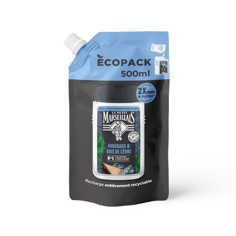 Envie de fraîcheur pour bien commencer la journée ? Optez pour la recharge Écopack 500ml du Gel Douche Homme 4 en 1 Le Petit Marseillais® aux Minéraux et Bois de Cèdre.