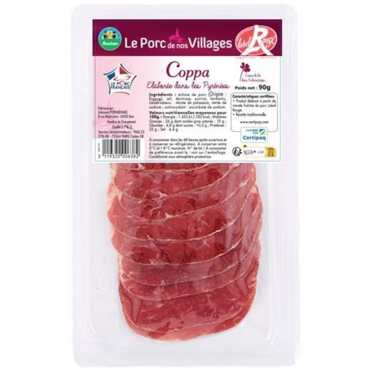 Ingrédients : Echine de porc origine France, sel, dextrose, poivre, ferments, conservateurs : nitrate de potassium, nitrite de sodium; antioxydant : ascorbate de sodium