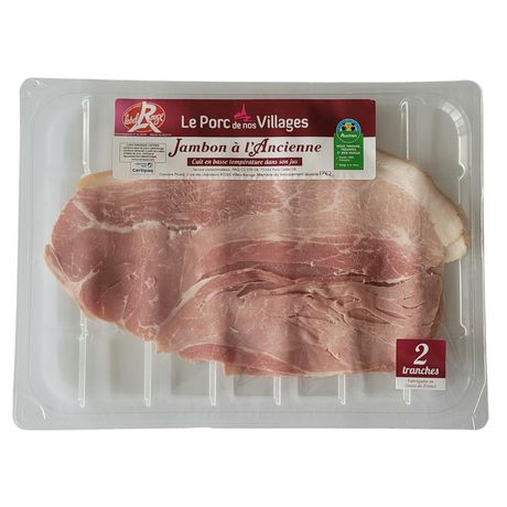 Jambon blanc cuit à l'ancienne 2 tranches de 60g Porc de nos villages Le jambon est élaboré sous le process à l'ancienne salé à la veine et cuit dans son jus durant 19 heures