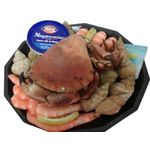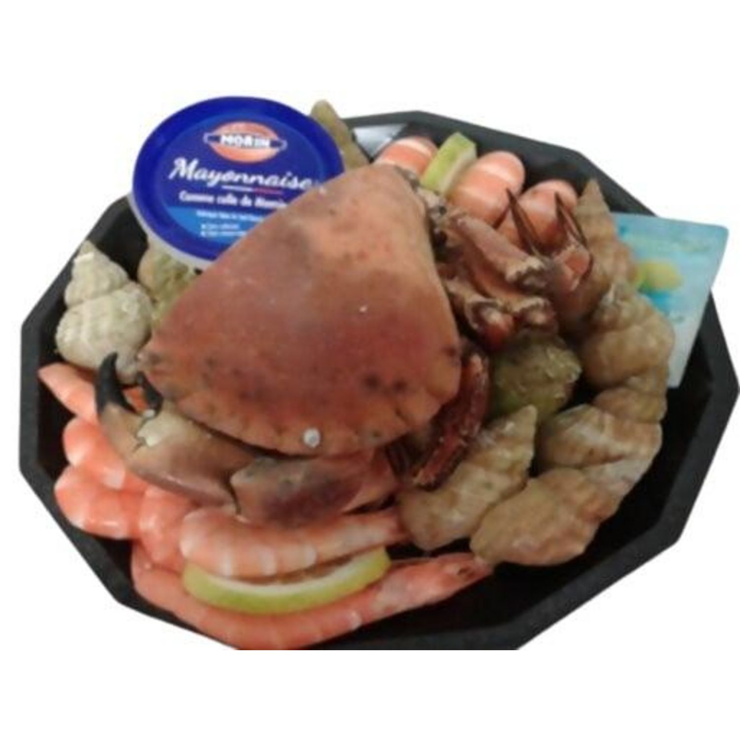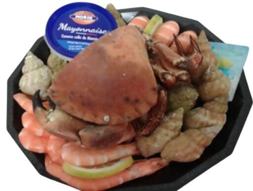 LANGOUSTE cuite,Buccinum undatum, CREVETTES (SULFITES), Nephrops norvegicus, Mayonnaise (Huile de colza, eau, jaune D'OEUF, MOUTARDE (eau, graine de MOUTARDE, vinaigre d'alcool, sel, antioxydant : diSULFITE de potassium, acidifiant : acide citrique), vinaigre d'alcool, sel, sucre, amidon modifié, colorants : lutéine et extrait de paprika, arôme).
