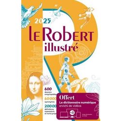 Avec plus de 75 000 mots et 35 000 noms propres , Le Robert illustré est le dictionnaire de référence pour tous. Une édition 2025 entièrement actualisée et consultable également en ligne. La référence de la langue française et de la culture Plus de 70 000 mots, 145 000 définitions et exemples. 60 000 renvois vers des synonymes, des contraires ou des mots de la même famille. 20 000 expressions et locutions , plus de 2 000 citations. L'étymologie de plus de 30 000 mots. 35 000 noms propres : personnalités, lieux et évènements. 6 000 illustrations, photos, schémas, dossiers et planches encyclopédiques. Des cartes géographiques et historiques. Une recherche rapide et facile Mots et noms propres altés ensemble. Votre accès au Robert illustré en ligne Tous les contenus du dictionnaire enrichis. Un conjugateur de verbes. 100 vidéos patrimoniales sur l'histoire. Une chronologie et un atlas interactifs. Configurations requises pour accéder au Robert illustré en ligne L'accès au Robert illustré en ligne se fait grâce à l'activation du code imprimé sur la carte qui accompagne l'ouvrage. L'activation doit être réalisée avant le 31/12/2027 et ouvre un accès pendant quatre ans à compter de la date d'activation. Support : tout ordinateur, tablette et smartphone disposant d'une connexion à Internet sur un système compatible (Chrome OS, Windows, macOS, Linux, iOS, iPadOS ou Android) Résolution : une résolution d'écran de 1 024 x 768 ou supérieure est conseillée Navigateurs : tous les navigateurs Internet : Google Chrome, Safari, Edge, Firefox, Opera, etc. Cookies : votre navigateur doit être paramétré pour accepter les cookies (du moins pour la ressource) Pop-ups : de même, votre navigateur doit être paramétré pour accepter les fenêtres surgissantes ou pop-ups (du moins pour le site de la ressource), certaines fenêtres de ce type apparaissant lors de la consultation Mots prononcés : votre navigateur doit pouvoir lire les fichiers audio au format MP3 PDF : certaines annexes des applications sont consultables au format PDF En cas de problème, contactez notre service Relation clients : relation. clients@lerobert. com.