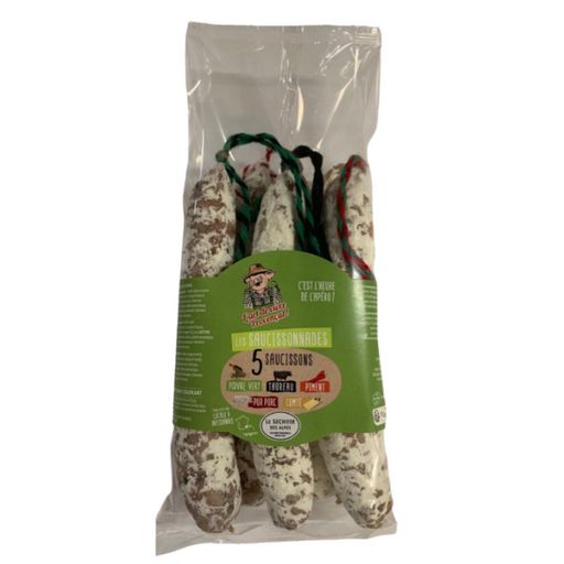 Saucisson au poivre vert : Viande de porc (origine France), sel, LACTOSE, sirop de glucose, dextrose, poivre vert (0,9%), épices, plante aromatique, conservateur: nitrate de potassium, ferments lactiques. Boyau naturel de porc.
