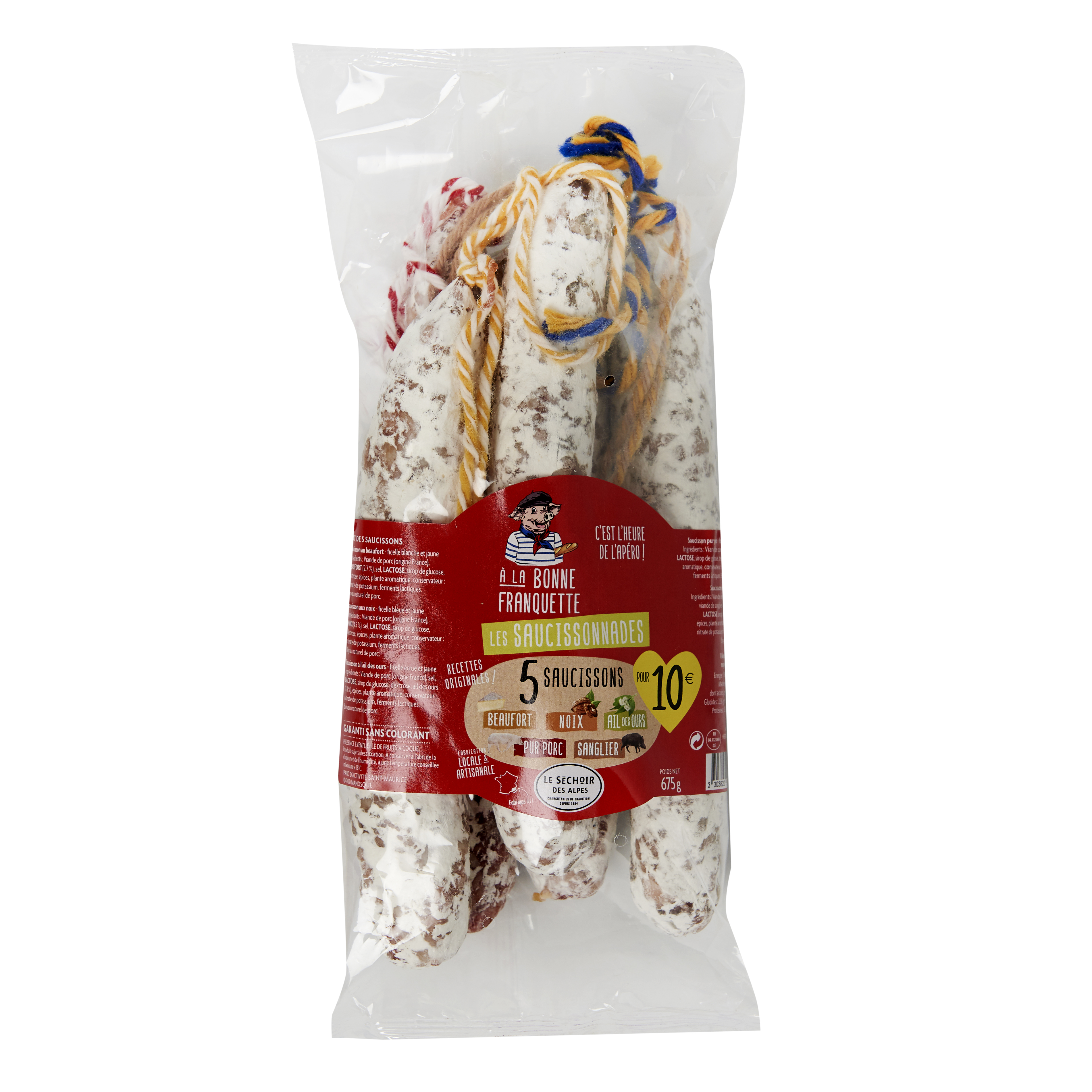 Saucisson à l'ail des ours: Ingrédients : Viande de porc (origine France), sel, sucres (LACTOSE, sirop de glucose, dextrose), ail des ours (2%), épices, plante aromatique, conservateur: nitrate de potassium, ferments lactiques. Boyau naturel de porc