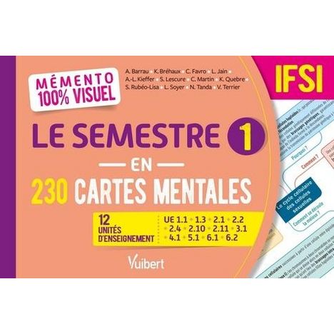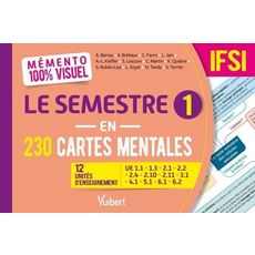 Un outil efficace pour préparer ses évaluations de fin de semestre 1 Retrouvez dans un seul livre les 12 unités d'enseigbement du semestre 1 (1re année) en 230 cartes mentales colorées et ludiques : UE 1. 1 Psychologie-sociologie-anthropologie , UE 1. 3 Législation-éthique-déontologie , UE 2. 1 Biologie fondamentale , UE 2. 2 Cycles de la vie et grandes fonctions , UE 2. 4 Processus traumatiques , UE 2. 10 Infectiologie-hygiène , UE 2. 11 Pharmacologie et thérapeutiques , UE 3. 1 Raisonnement et démarche clinique infirmière , UE 4. 1 Soins de confort et de bien-être , UE 5. 1 Accompagnement de la personne dans la réalisation de ses soins quotidiens , UE 6. 1 Méthodes de travail , UE 6. 2 Anglais.