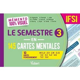 Un outil efficace pour préparer ses évaluations de fin de semestre 3. 145 cartes mentales en couleurs sur toutes les unités d'enseignement du semestre 3 (2e année) : - UE 1. 2 Santé publique et économie de la santé , - UE 2. 5 Processus inflammatoires et infectieux , - UE 2. 8 Processus obstructifs , - UE 2. 11 Pharmacologie et thérapeutiques , - UE 3. 2 Projets de soins infirmiers , - UE 3. 3 Rôles infirmiers, organisation du travail et interprofessionnelle , - UE 4. 2 Soins relationnels , - UE 4. 6 Soins éducatifs et préventifs , - UE 5. 3 Communication et conduite de projet , - UE 6. 2 Anglais.