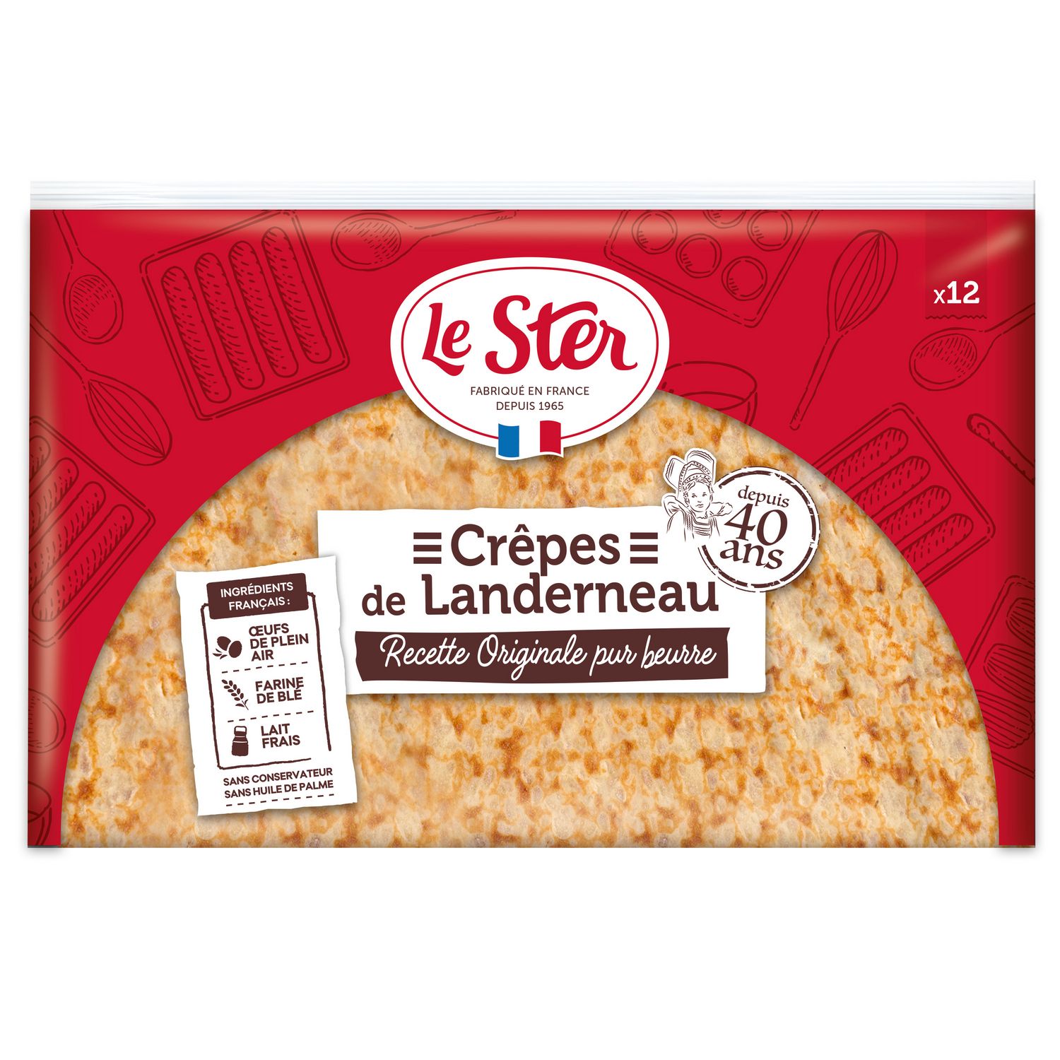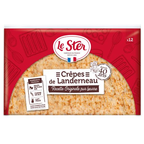 DÉCOUVREZ LA CRÊPE DE LANDERNEAU LE STER LE PÂTISSIER !SON SECRET ? ELLE EST ÉLABORÉE AVEC DES ŒUFS-EXTRA FRAIS, UNE FARINE DE BLÉ CERTIFIÉE, DU BEURRE PÂTISSIER ET EST GARANTIE SANS HUILE DE PALME ET SANS CONSERVATEUR CETTE DÉLICIEUSE CRÊPE FINE SE CONSOMME AUSSI BIEN FROIDE QUE RÉCHAUFFÉE. PRODUIT FABRIQUE EN FRANCE