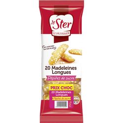 SAVOUREZ LA MADELEINE LONGUE LE STER LE PATISSIER QUI ALLIE LE MOELLEUX DE LA MADELEINE AU CRAQUANT DES PEPITES DE SUCRESON SECRET ? ELLE EST ELABOREE AVEC DES OEUFS FRAIS ET UNE FARINE CERTIFIEEGARANTIE SANS HUILE DE PALME ET SANS CONSERVATEUR, ELLE RAVIRA LES PAPILLES DES PETITS ET DES GRANDS.PRODUIT FABRIQUE EN FRANCE madeleines longues aux pépites de sucre
