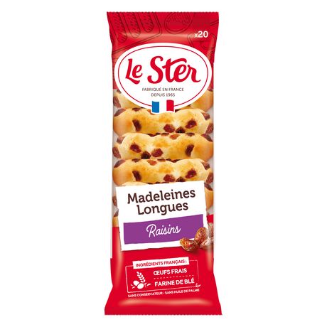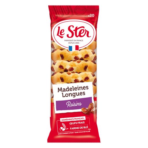 SAVOUREZ LA MADELEINE LONGUE LE STER LE PÂTISSIER QUI ALLIE LE MOELLEUX DE LA MADELEINE AU BON GOÛT DU RAISIN SON SECRET ? ELLE EST ÉLABORÉE AVEC DES ŒUFS FRAIS ET UNE FARINE UNE FARINE DE BLÉ FRANÇAISE ET RESPONSABLE. GARANTIE SANS HUILE DE PALME ET SANS CONSERVATEUR, ELLE RAVIRA LES PAPILLES DES PETITS ET DES GRANDS.PRODUIT FABRIQUE EN FRANCE.