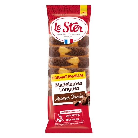 SAVOUREZ LA MADELEINE LONGUE LE STER LE PÂTISSIER QUI ALLIE LE MOELLEUX DE LA MADELEINE AU BON GOÛT DU CHOCOLAT. SON SECRET ? ELLE EST ÉLABORÉE AVEC DES ŒUFS FRAIS ET UNE FARINE DE BLÉ FRANÇAISE ET RESPONSABLE. GARANTIE SANS HUILE DE PALME ET SANS CONSERVATEUR, ELLE RAVIRA LES PAPILLES DES PETITS ET DES GRANDS.PRODUIT FABRIQUE EN FRANCE.