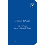 Écrit en 1453 par l'auteur de La Docte Ignorance, Le Tableau ou la vision de Dieu est un texte unique en son genre, dont est proposée ici une traduction devenue introuvable. Le penseur de la coïncidence des contraires pose la question du rapport entrevoir et être vu : tout le propos s'organise à partir d'un tableau, un autoportrait de Rogier Van der Weyden, qui suit du regard celui qui l'observe. Ainsi se développe la mise en scène d'un regard qui voit tout, chaque personne en particulier et toutes les personnes à la fois. Ce texte est aussi l'histoire d'un rapt, d'un ravissement, d'une conversion au Verbe divin. Du parler au voir , du voir au croire , une étonnante articulation éclaire notre compréhension du langage et de l'imagé.