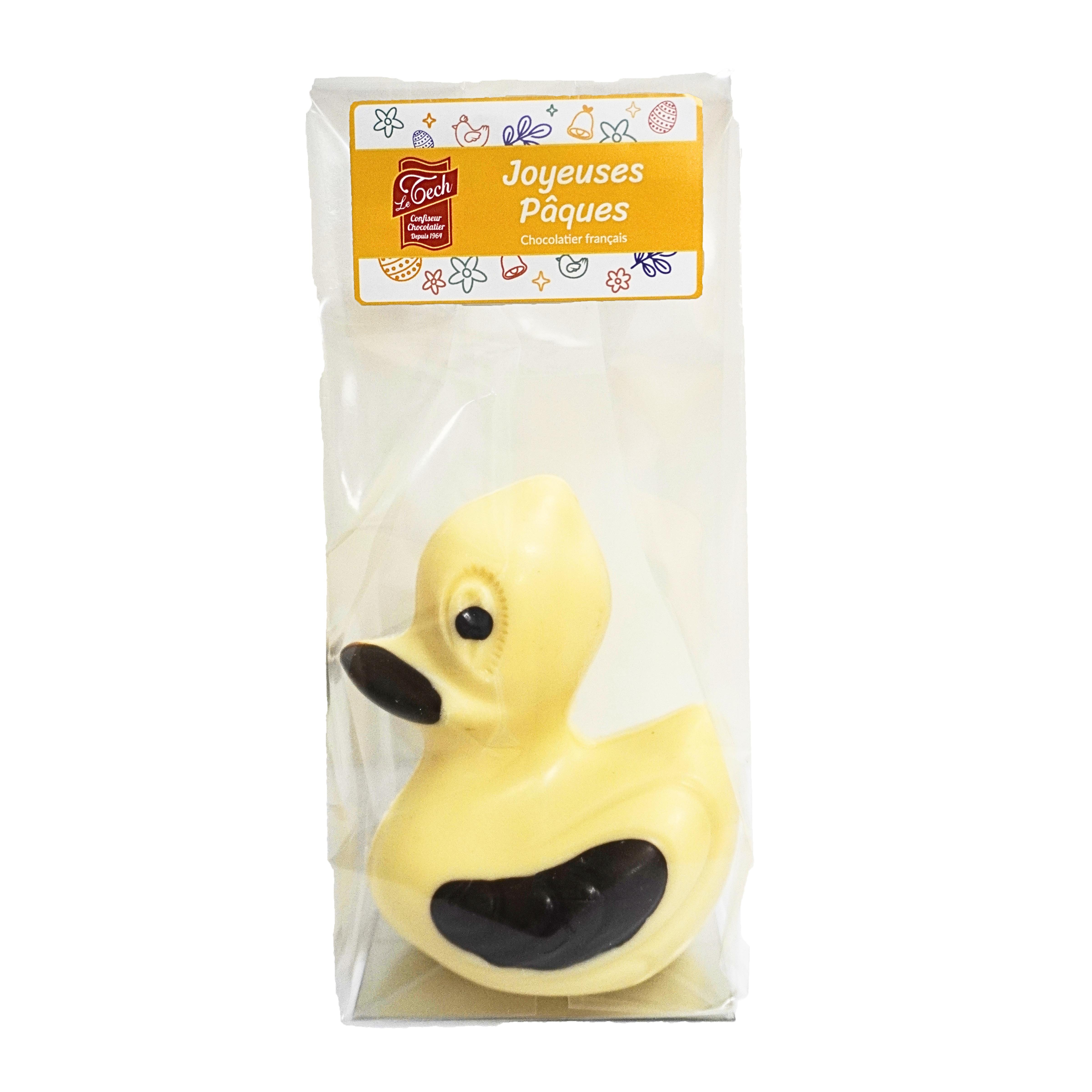 Ce caneton en chocolat blanc attends patiemment qu'on le découvre! Il est décoré et emballé à la main.