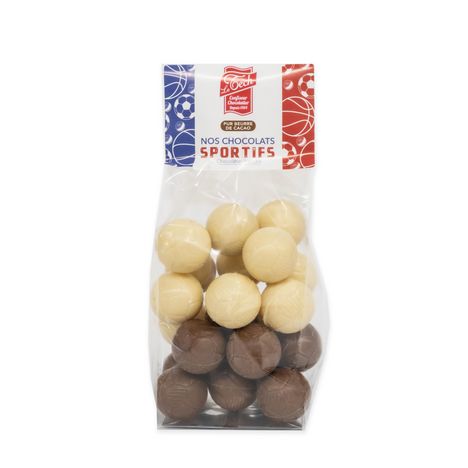 Un assortiment de petits ballons de foot pour les sportifs gourmands, en chocolat au lait et blanc. Emballés à la main, ces petites bouchées sont, comme les évènements sportifs, l'occasion de créer des moments de partage!