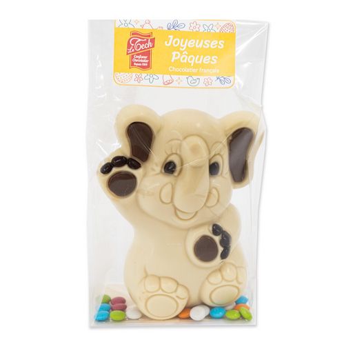 Amusant éléphant en chocolat blanc entouré de mini confettis. Décoré et emballé à la main, Fanfan vous fera découvrir avec plaisir et gourmandise sa vie dans la savane!