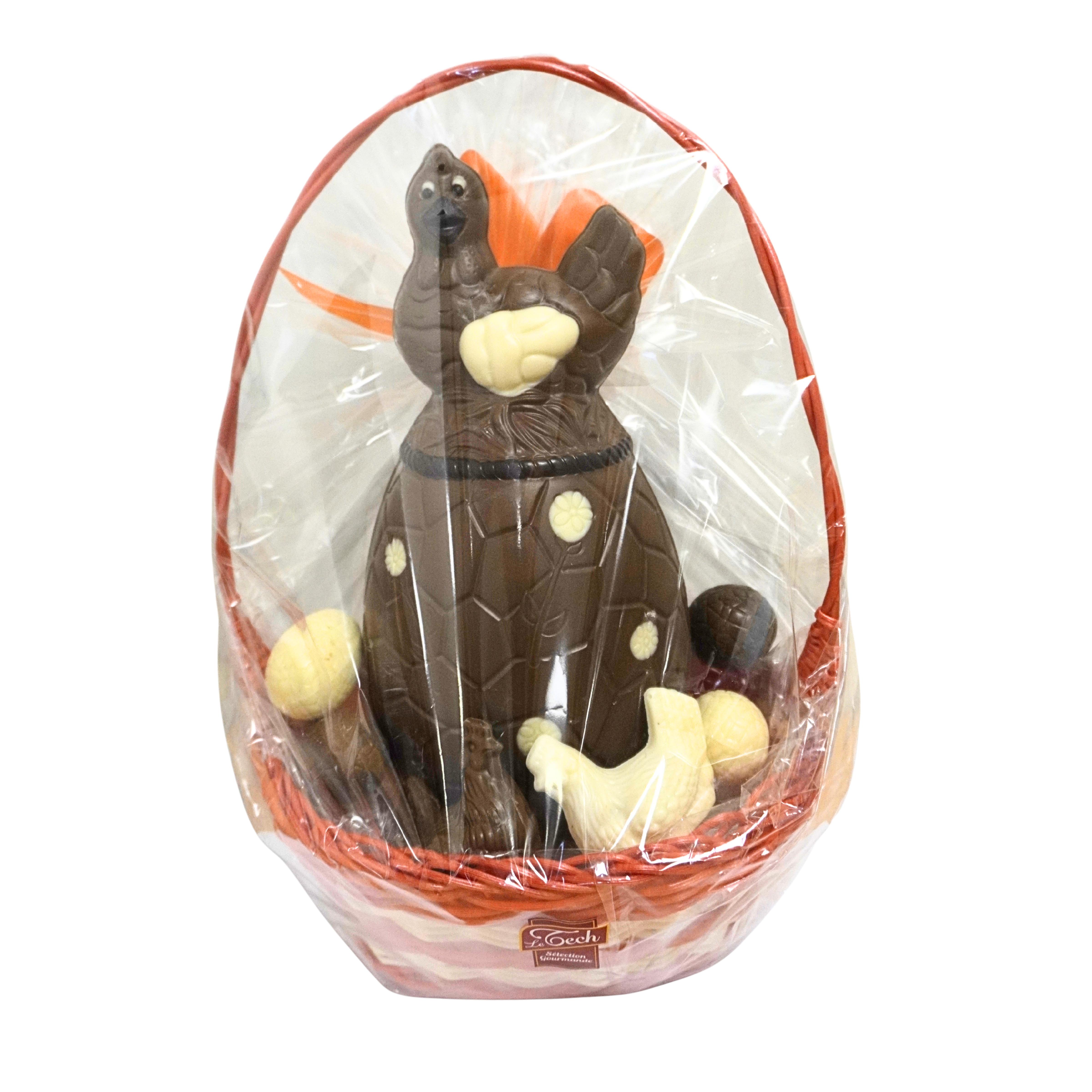 Un bel œuf surmonté de sa poule en chocolat lait 32% de cacao et entouré de sujets chocolat lait blanc et noir…Ce panier emballé à la main est non seulement ravissant mais il comporte tous les symboles de Pâques. A offrir sans hésitations!