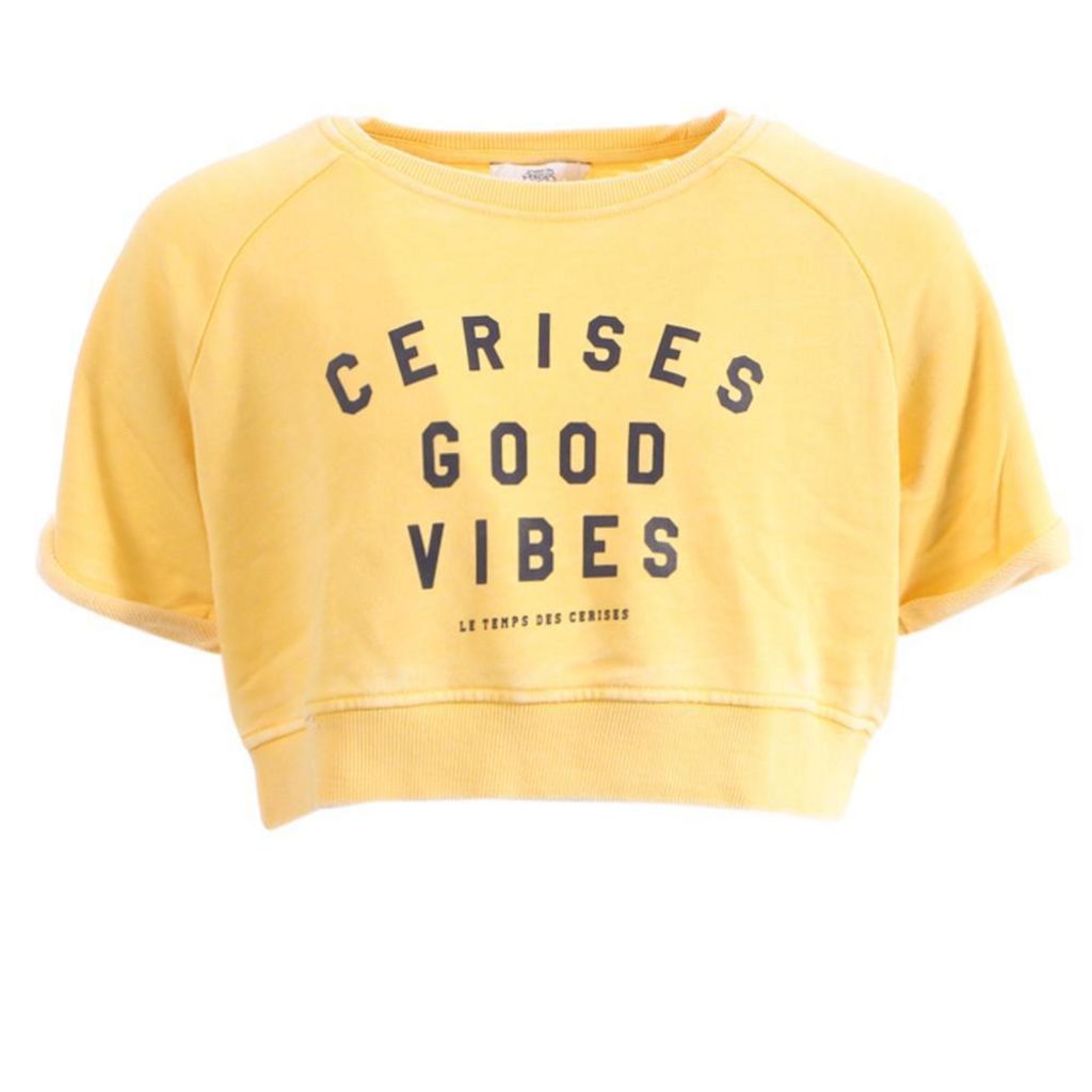 Sweat pour fille de la marque Le Temps des Cerises Col rond Manches courtes Coloris : Jaune Coupe courte Inscription sur l'avant Composition : 60% coton , 40% polyester