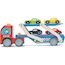 Un joli transporteur de voitures . La rampe supérieure peut être abaissée pour permettre le chargement des voitures. L'ensemble comprend 4 voitures de course et une feuille de 36 autocollants colorés représentant les numéros de voiture 1 à 4 et des illustrations sur le thème de la route. Les véhicul