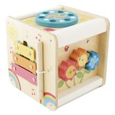 Un cube d'activités multifonctionnel pour les tout-petits, avec une belle structure en bois et un design compact. Ce petit centre d'activités complet comprend : une porte à ouvrir, une roue qui tourne, des volets ABC/123, un xylophone, trois engrenages dans un motif floral à faire tourner et deux oiseaux qui glissent sur un arbre d'automne.