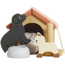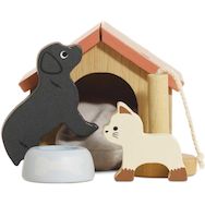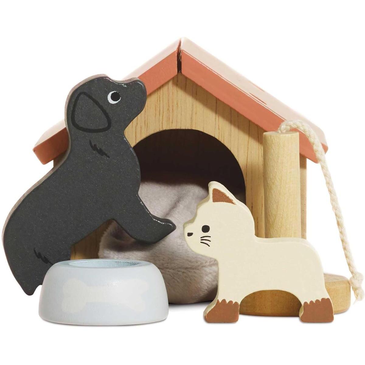 Cet adorable ensemble de 6 pièces d'animaux de compagnie est prêt pour des aventures de jeux miniatures. Composé d'un chien, d'une niche, d'une gamelle, d'un chat, d'un griffoir et d'un lit. pour animaux en peluche, ces amis à fourrure amusants sont fabriqués en bois naturel certifié FSC et peints avec une peinture non toxique.
