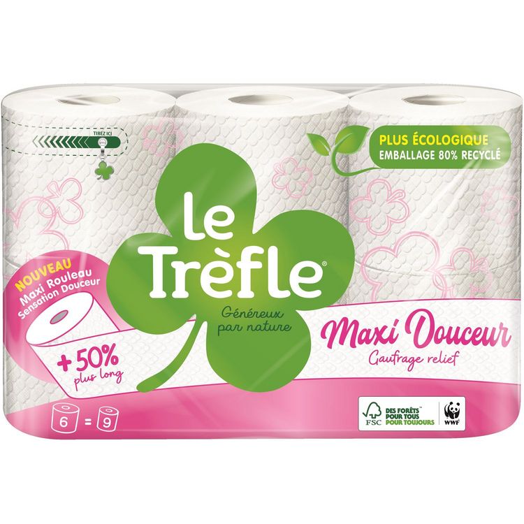 Le Trèfle® Maxi Douceur, le papier hygiénique choisi par toute la famille pour ses maxi rouleaux qui durent vraiment + longtemps, sa douceur remarquable et son emballage + écologique 80% recyclé. Papier Toilette Le Trèfle Maxi Douceur FSC x6 rouleaux =9
