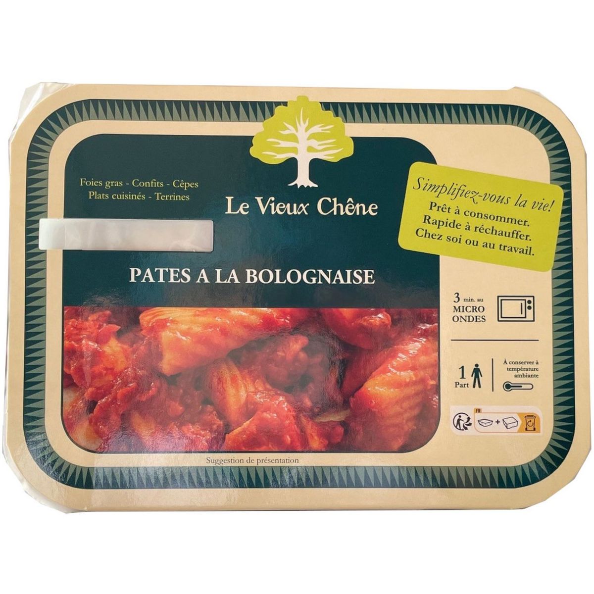 Bolognaise : 60% ingrédients : tomate 35% ((acide citrique), échalote, oignons, amidon de Maïs)), viande de Veau 12% (Origine France), viande de Porc 12% (Origine France). Huile de tournesol.