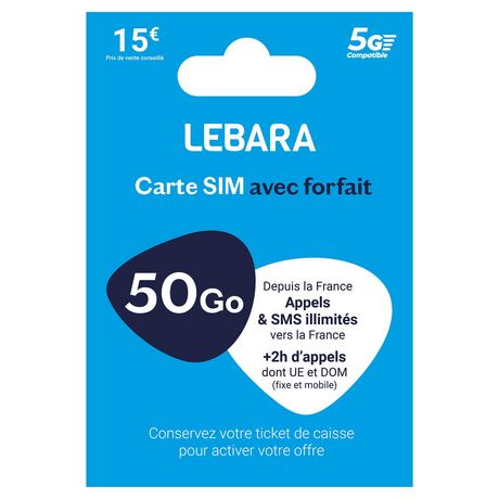 L’indispensable pour communiquer à petit prix ? La carte SIM prépayée LEBARA sans engagement s’adapte à votre téléphone grâce à ses trois formats : standard, micro et nano SIM. Elle comprend 12 Go avec appels et SMS illimités + 2h d’appels et possède la connexion 4G+