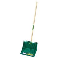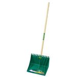 Pelle polyvalente réversible grand volume à rebords. Bord droit pour pousser ou pelleter copeaux, neige, sciure, sable. Bord dentelé pour rassembler et ramasser feuilles, gazon, nettoyer un bassin. Largeur 42cm, hauteur 39cm.Manche bois.