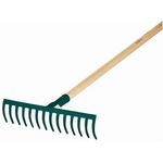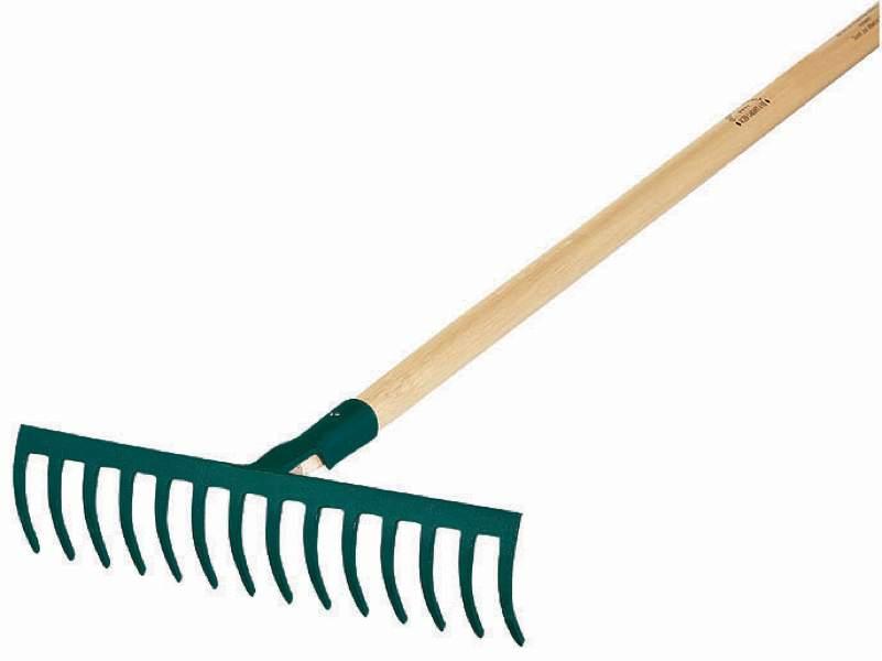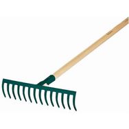 Pour ramasser les déchets, feuilles et cailloux... pour briser les mottes après le bêchage, affiner la terre et niveler les sols. Dents entièrement trempées pour une meilleure résistance dans les travaux durs. Largeur 40cm, 16 dents. Equipé d'un manche en bois percé.