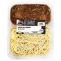 Ingrédients : Nouilles chinoises cuites 38% (eau, farine de BLE, sel), viande de boeuf* 20% [viande de boeuf, fécule de tapioca, sel], oignons 17%, eau, huile de tournesol, sauce soja (eau, graines de SOJA, farine de BLE, sel), huile de SESAME, arômes naturels, farine de tapioca, ail, vinaigre de Xérès, sel, graines de SESAME, colorant : caramel ordinaire, sucre, épices, cardamome, coriandre, gingembre.