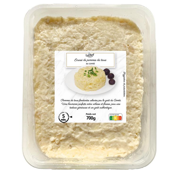 Ingrédients : Pomme de terre 62%, CREME 15%, eau, oignon, COMTE AOP 4%, BEURRE, sel, farine de tapioca, fibre de lin, poivre, muscade.