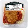 Ingrédients : Spaghetti cuit 33% (eau, semoule de BLE dur), escalope de dinde reconstituée traitée en salaison panée 29% (filet de dinde reconstitué 15% - Origine UE, farine de BLE, eau, huile de tournesol, sel, dextrose, gluten de BLE, levure, épices), concassé de tomate 17% (pulpe de tomate, jus de tomate), eau, concentré de tomate 3%, oignon, échalote, huile d'olive vierge extra 1,5%, huile de colza, ail, sel, basilic, sucre, poivre.